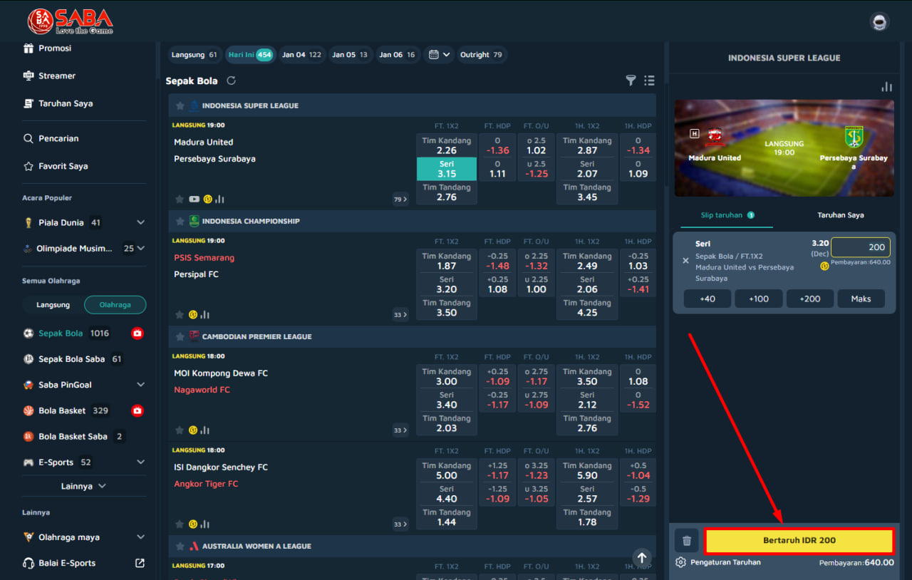 Berikut langkah mudah memasang taruhan Single Bet 1X2: