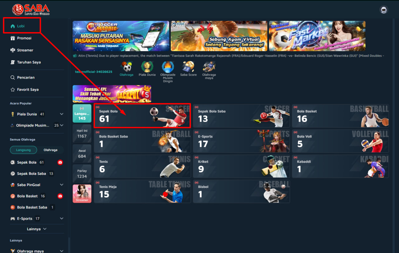 Masuk ke menu Sports / Sportsbook